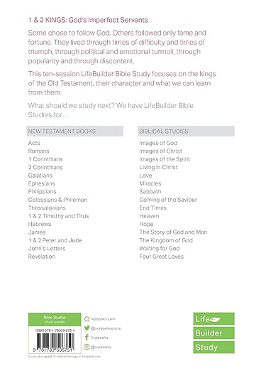 Some chose to follow God. Others followed only fame and fortune. They lived through times of difficulty and times of triumph, through political and emotional turmoil, through popularity and through discontent. This ten-session LifeBuilder Bible Study focuses on the character of the Kings of the Old Testament and what we can learn from them.For over three decades LifeBuilder Bible Studies have provided solid biblical content and raised thought-provoking questions—making for a one-of-a-kind Bible study experience for individuals and groups. This series has more than 120 titles on Old and New Testament books, character studies, and topical studies.