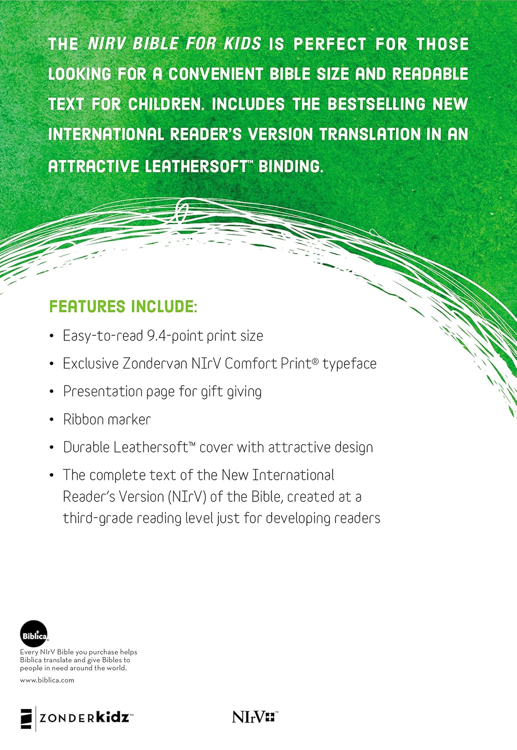 The NIrV Bible for Kids, Large Print is perfect for those looking for an easy-to-carry, extremely readable Bible for children and developing readers. Including the New International Reader’s Version (NIrV) translation in a colorful Leathersoft™ binding, this Bible makes a perfect gift for holidays, graduations, or confirmations; to commend other special achievements; or simply as a beautiful new addition to your children’s library. The NIrV Bible for Kids, Large Print is set in the exclusive Zondervan NIrV Comfort Print® typeface in an 11-point print size, making it extremely easy to read for children.