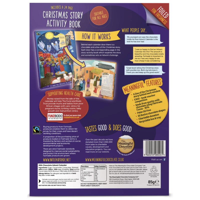 The Real Advent Calendar is a fun way for parents, grandparents and Godparents to share the Christmas story. The calendar comes with a free 24-page Christmas story activity book designed to be used every day in Advent. This year, the book is illustrated by award winning artist, Martina Peluso. Behind each of the 25 windows there is a festive Fairtrade milk chocolate.
