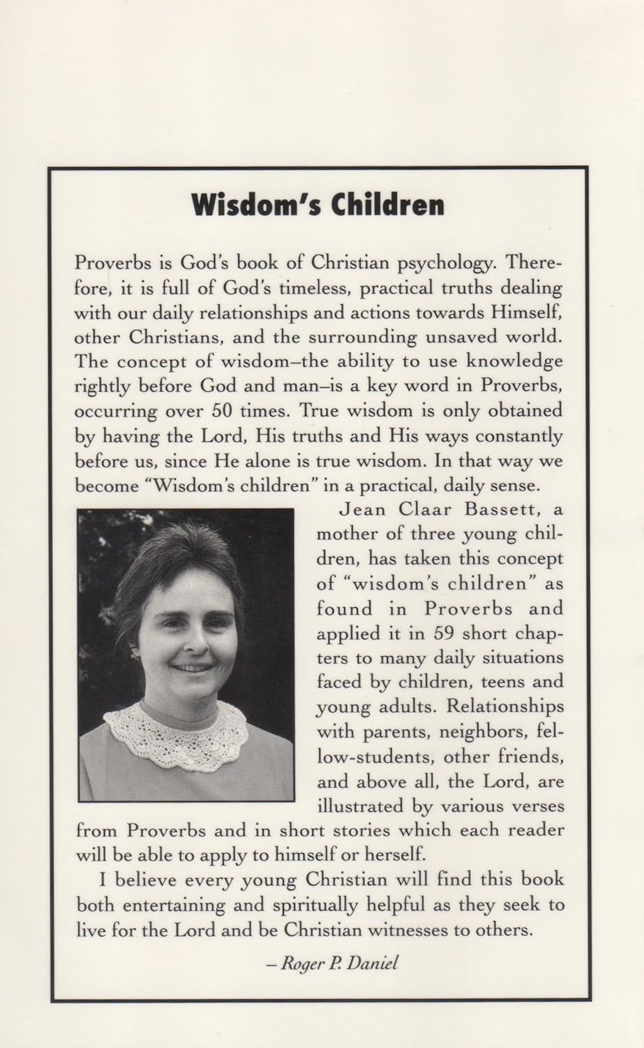 Proverbs is God's book of Christian psychology. Therefore, it is full of God's timeless, practical truths dealing with our daily relationships and actions towards Him, other Christians, and the surrounding unsaved world. The concept of wisdom--the ability to use knowledge rightly before God and Man--is a key word in Proverbs, occurring over 50 times. True wisdom is only obtained by having the Lord, His truths and His ways constantly before us, since He alone is true wisdom. In that way we become "Wisdom's Children" in a practical, daily sense. Jean Claar Bassett, a mother of three young children, has taken this concept of "wisdom's children" as found in Proverbs and applied it in 59 short chapters to many daily situations faced by children, teens and young adults. Relationships with parents, neighbors, fellow-students, other friends, and above all, the Lord by various verses from Proverbs and in short stories which each reader will be able to apply to himself or herself. I believe every young Christian will find this book both entertaining and spiritually helpful as they seek to live for the Lord and Be Christian witnesses to others. --Roger P. Daniel